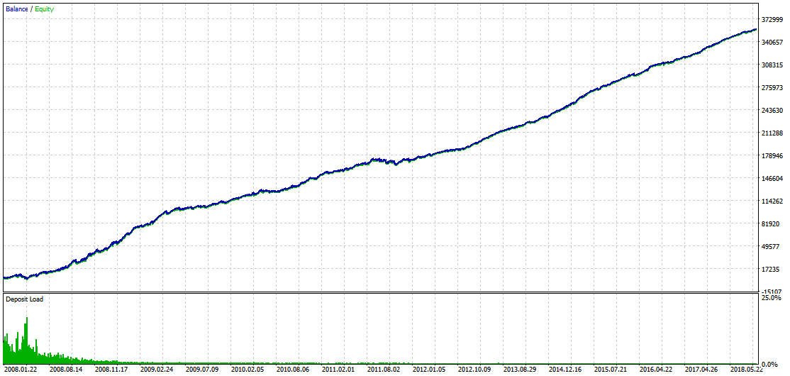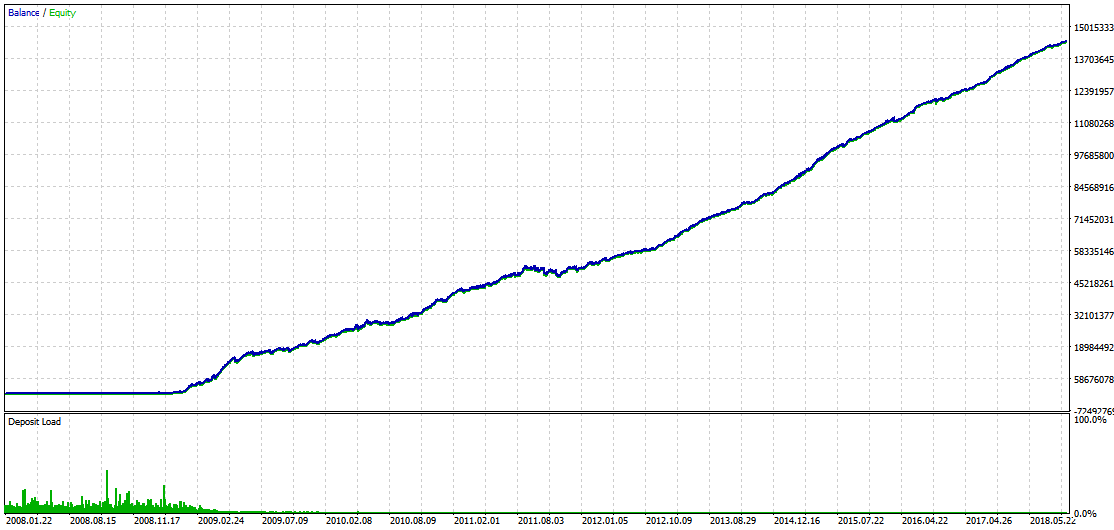 아래 그림. 상기 매매 전략의 2008년 1월 1일부터 2018년 12월 31일까지의 10년동안의 매매 평가 그래프.