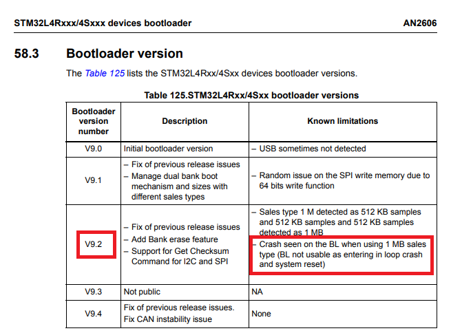 본 오류는 ST 문서 AN2606 페이지 296 에서 부트로더 version 9.2 에서 1Mbyte 플래시 적용된 모든 칩에서 오류증상이 있고, 부트로더 기능 작동하지 않는다고 되어있다. (아래 그림 붉은 박스 부분)