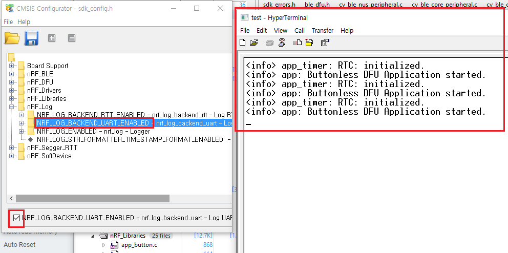 즉, 이 값을 1로 설정하면 NRF_LOG_ 출력은 UART 로도 출력되면서 아래 오른쪽 화면처럼 PC 의 하이퍼 터미널에도 출력된다. 단, 대상보드가 PC 로 USB CDC 통신 경로 지원되는 PCA10056 같은 보드여야 한다.