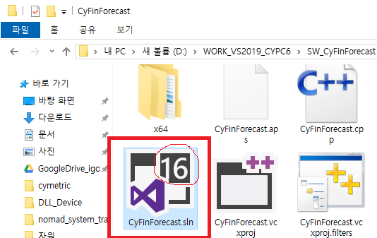 - 확장자 .sln 이 솔루션 파일이며 이 파일 앞에 부착된 아이콘에 표기된 번호를 보면 어떤 버전의 Visual Studio 로 제작된 것인지 확인가능하다. 아래예는 VS2019 에서 작업된 솔루션 파일의 아이콘에 보이는 숫자가 16임을 알 수 있다.