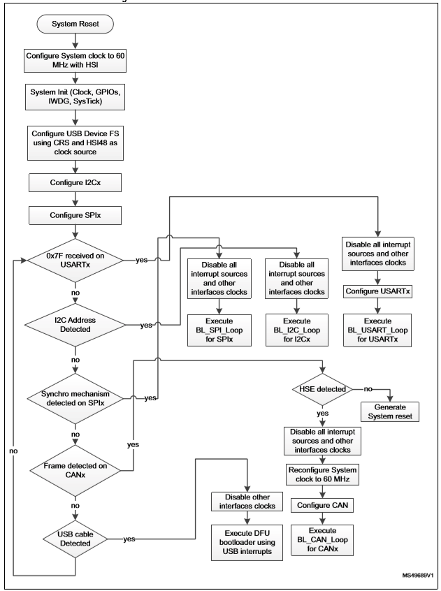 - USART, I2C, USB bootloader 작동위하여 HSI(내장 클럭소스) 가 enable 되고 system clock 는 60MHz 로 설정된다.