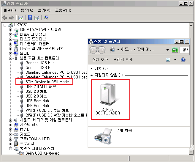 - 부트로더 중에 USB DFU 모드 매우 편리하며 STM32 를 PC 로 USB 연결한 상태에서 STM32 를 부트로더로 진입시킨 경우 아래 그림처럼 인식된다.