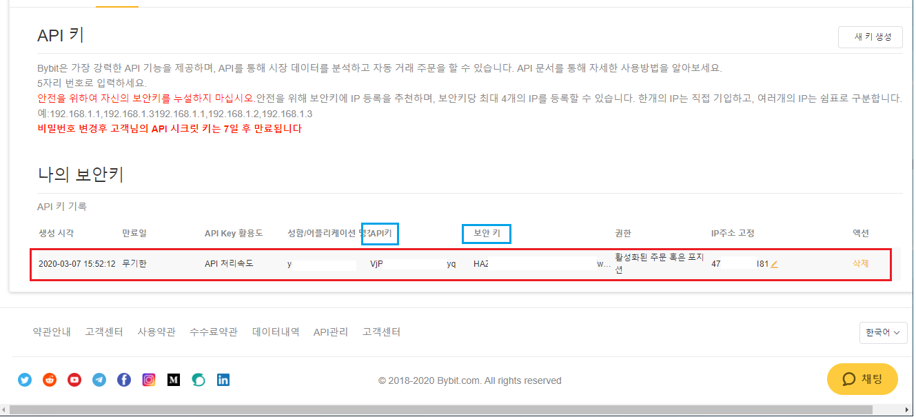 - 비밀번호 변경하면 API 키는 7일후 만료됨.