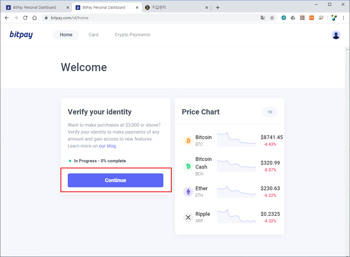 첫화면에 보이는 개인 신원 증명을 완료해야 bitpay 에서 자금이체등이 가능해진다. 위 그림의 버튼 Continue 클릭하여 개인신원증명 진행하자. 여권 준비하고 진행하는게 편리함. 사진과 동시에 폰의 카메라 기능으로 본인 얼굴 촬영 하면서 진행되므로 스마트폰에서 진행해야함.
