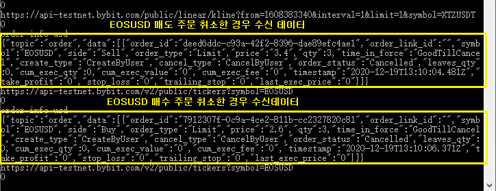 거래소 바이빗의 USD 종목, USDT 종목 내가 주문 송신한것에 의한 WebSocket 으로 실시간 수신되는 주문응답.