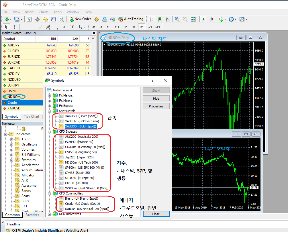 메타 트레이더는 FX마진 외에도 나스닥, S&P500 같은 지수종목, 골드와 같은 금속류, 크루드오일 등도 거래 가능하다. CFD 종목이라고 부름.