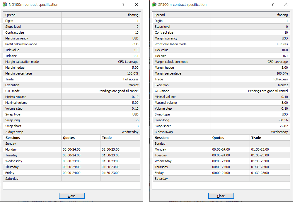 - 심볼 우마우스 클릭하여 specification 클릭하면 아래 처럼 해당 종목의 정보 볼 수 있다.