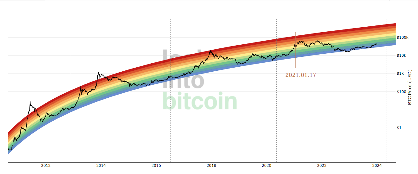 - 앞의 가격 챠트는 2021년 1월 17일 시점까지였으며 , 현재(2024년 1월 1일) 까지의 가격 변화를 보면 여전히 상승 밴드 내에 있으며 밴드 기준에서는 저가 영역에 있음.
