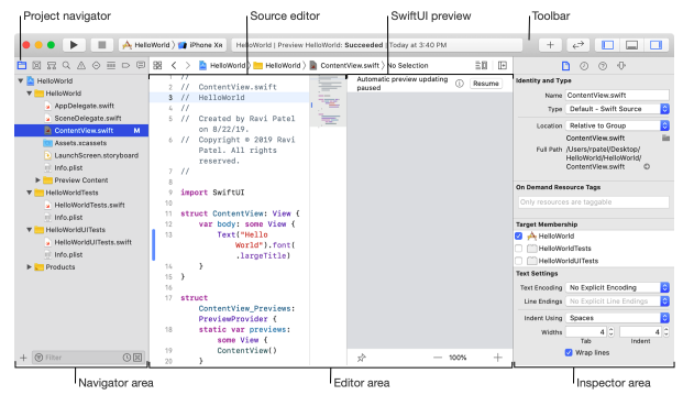개요 . Workspce. Xcode 의 Workspace ( 웍스페이스 ) 는 아래 그림 왼쪽 노란색 박스 부분의 "프로젝트 네비게이터" 에 여러 프로젝트들을 포함 할 수 있는 관리 형식이며 웍스페이스의 이름은 소스에디