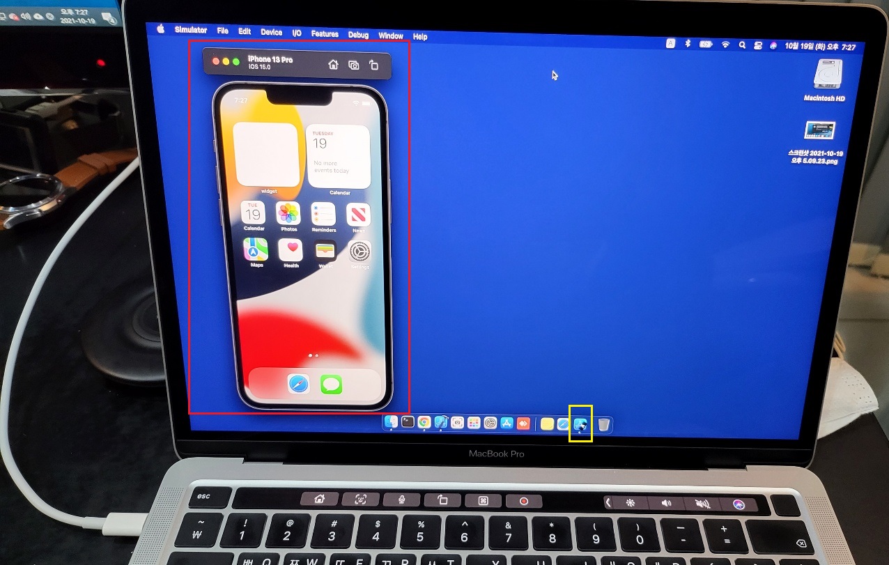- 아래 사진은 맥북 프로에서 시뮬레이터 실행모습이다. 붉은 박스부분이 iPhone 13 Pro 로 선택하여 시뮬레이터 실행중.