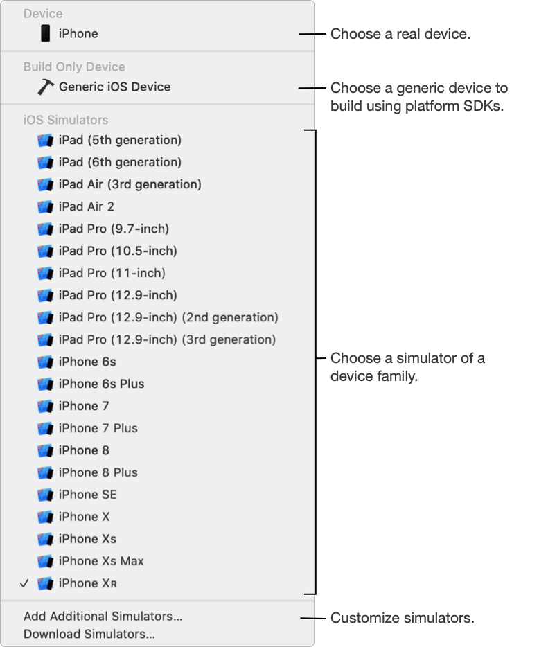 - 시뮬레이터 에서 제공하는 모의 기기들 : 운영체제 iOS 인 기기 (= 아이폰들), 운영체제 watchOS 인 기기 (애플워치들) , 운영체제 tvOS 인 기기들.