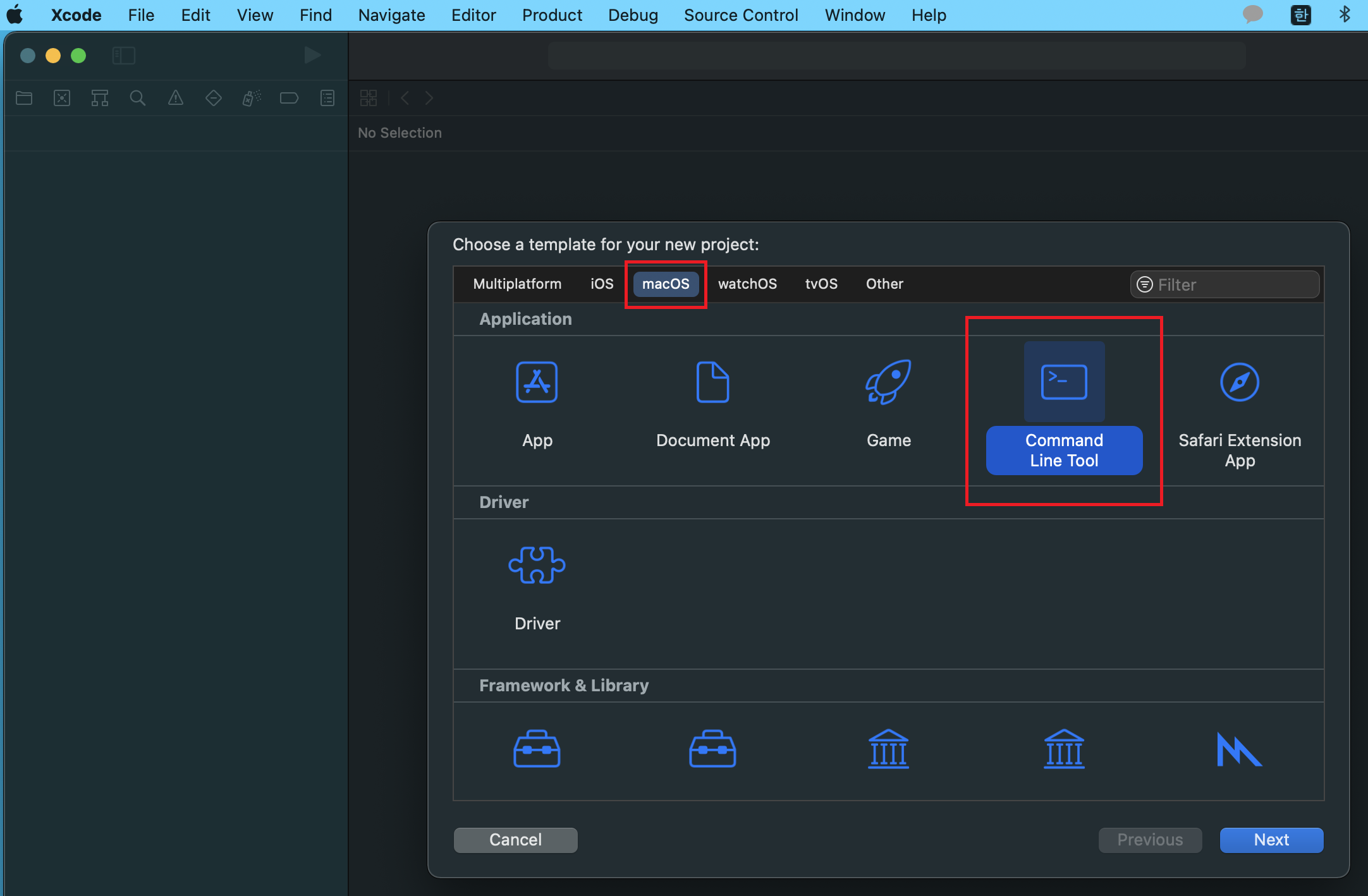 프로젝트 생성시 아래 그림처럼 mcOS 선택하고 Command Line Tool 선택하여 버튼 Next 클릭하면 되며