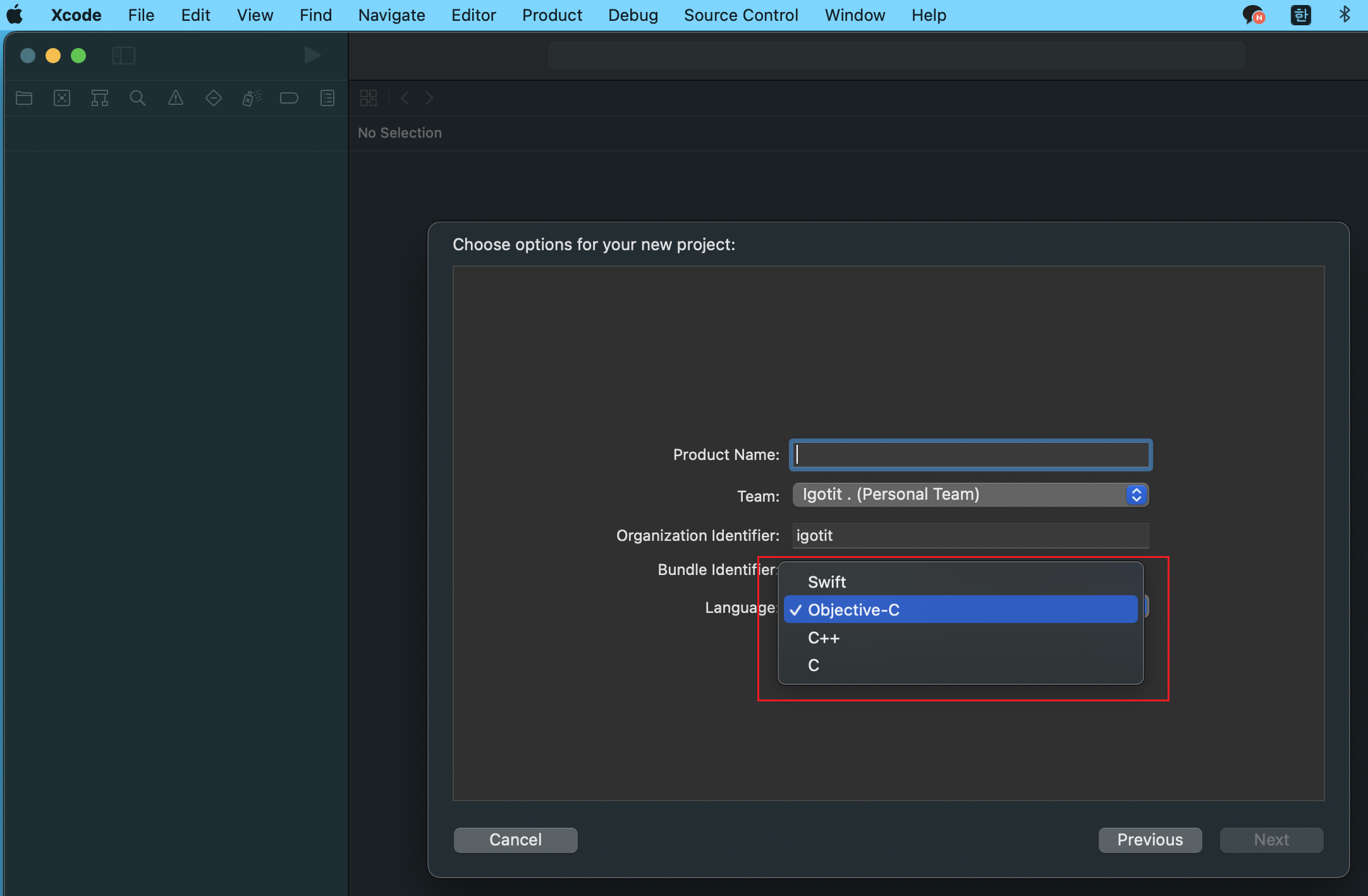 Xcode 에서 지원하는 언어인 C, C++, Objective-C, Swift  4종의 언어 모두에서 콘솔 프로젝트 만들 수 있다. 아래 그림은 앞에서 Command Line Tool 선택하고 Next 진행했을때 보이는 언어 선택 부분이다 .   C, C++, Objective-C, Swift  모두 Console 프로그램 제작 가능하다.