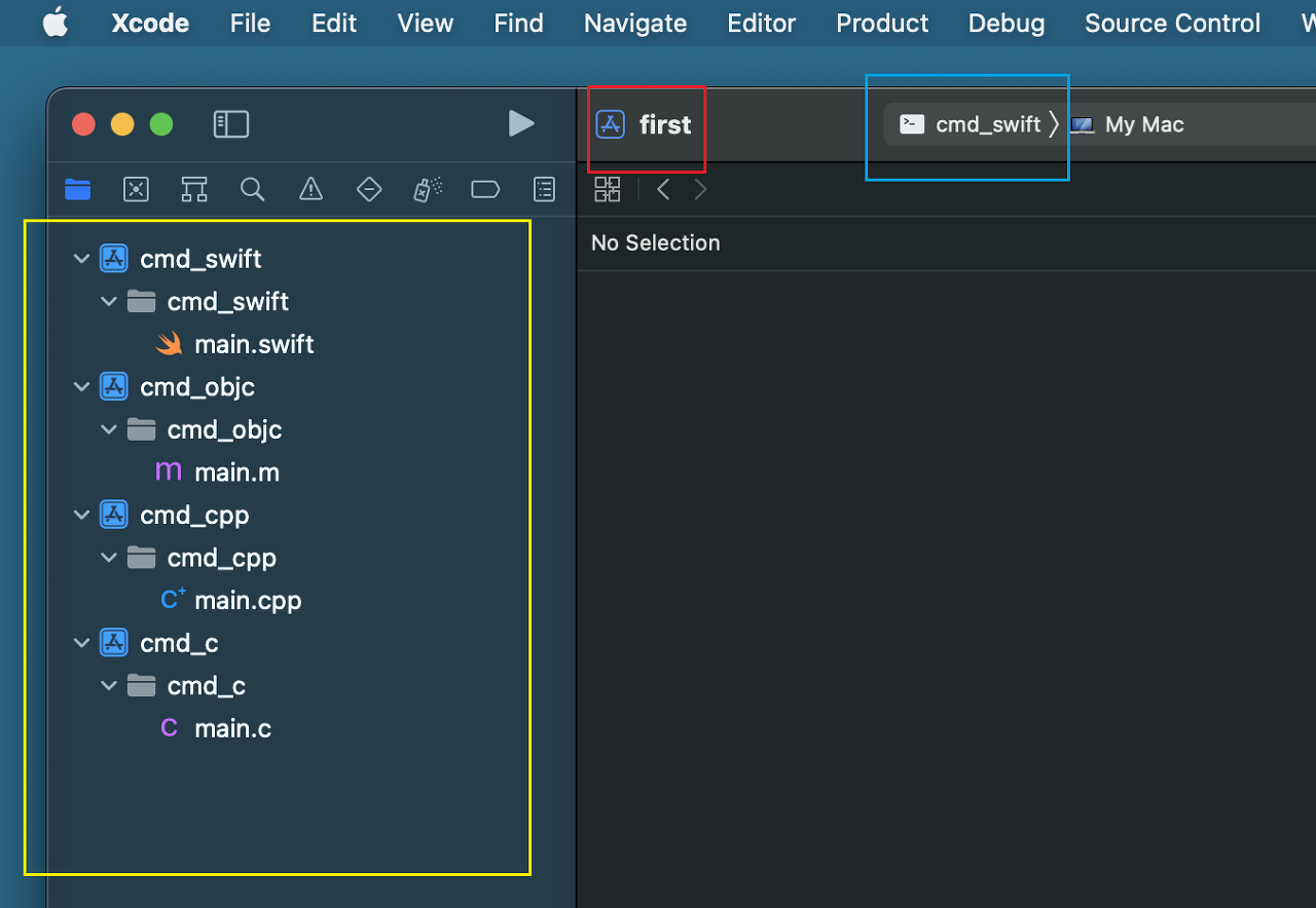 본 예에서는 Xcode 가 지원하는 4개의 언어  C, C++, Objective-C, Swift  각각별로 Command Line Tool 형식의 프로젝트 만들어서 1개의 웍스페이스 내에 생성한 예를 보인다. 웍스페이스 만들기는 여기 별도 정리