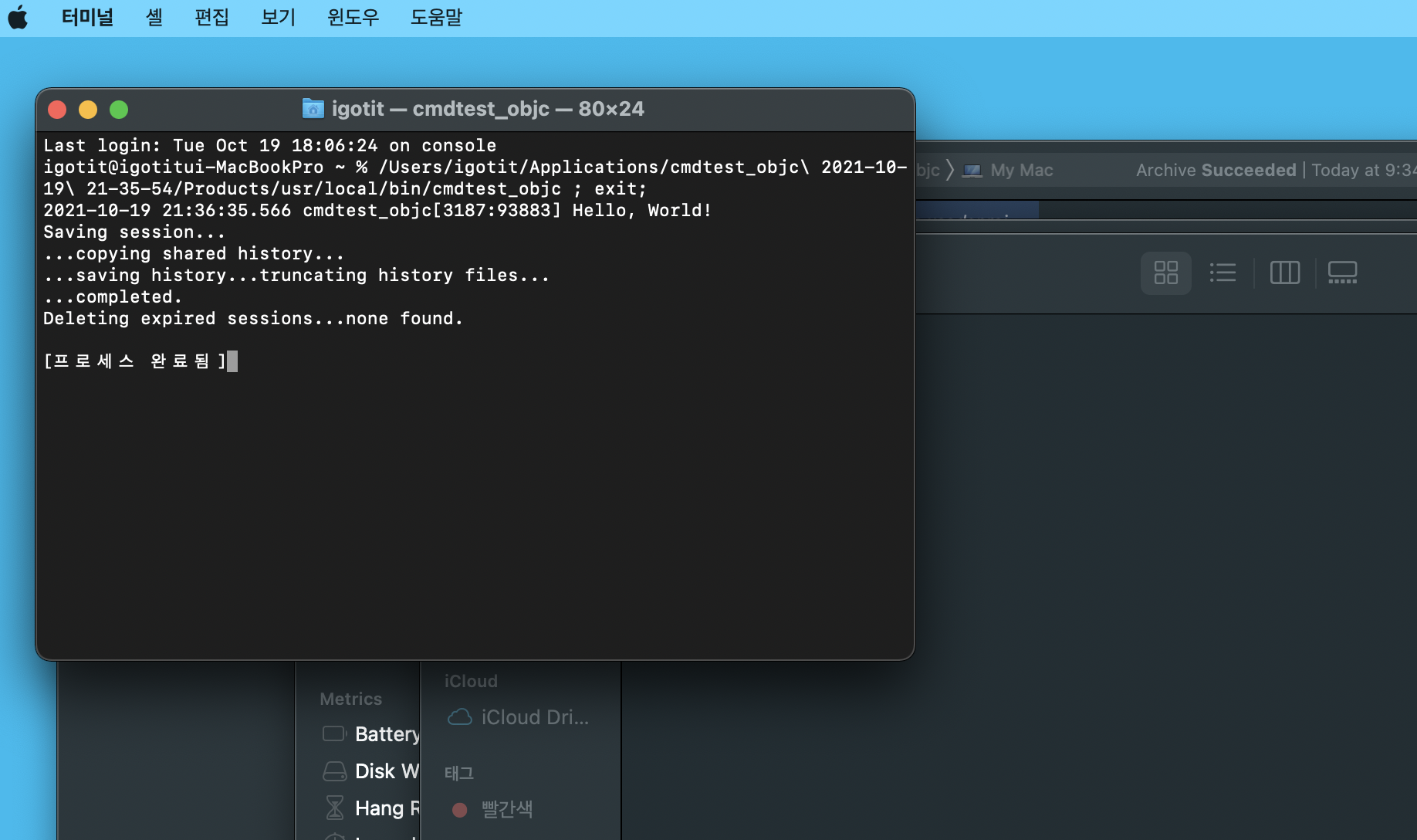 Xcode 에서 만든 프로그램 개발한것을 Xcode 내부적으로 "run" 으로 실행시 Xcode 하단의 콘솔에 출력되고  코드를 실행바이너리 파일로 만들어 실행시켰을 때는 터미널에 출력되는 형식으로  만들 수 있는 템플릿 명칭이 "Command Line Tool " 이다.