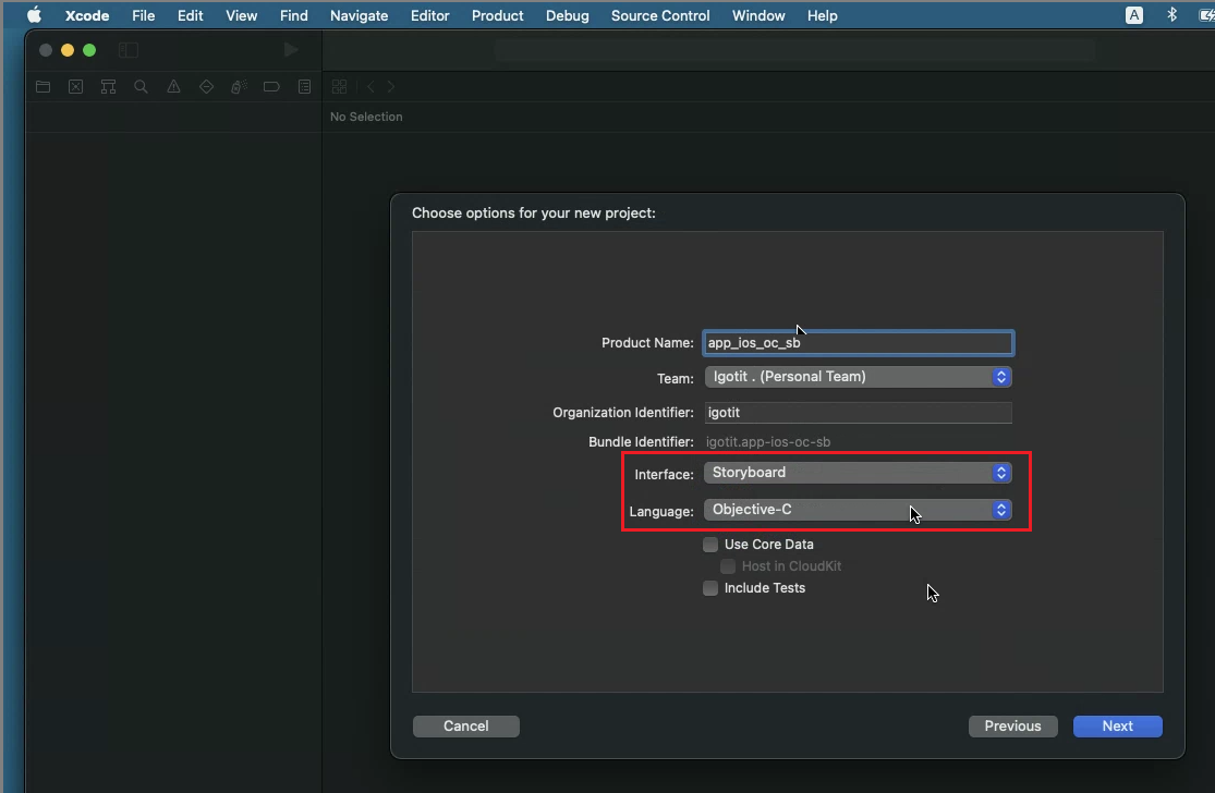 이후 보이는 아래 창에서 프로젝트 이름 지정하고 Interface 부분은 SwiftUI , Storyboard 2개 중 Storyboard 선택하고, Language 는 Swift, Objective-C 중에 Objective-C 선택 하고 버튼 Next 클릭한 이우 보이는 창에서 프로젝트 저장할 곳 지정 한다.