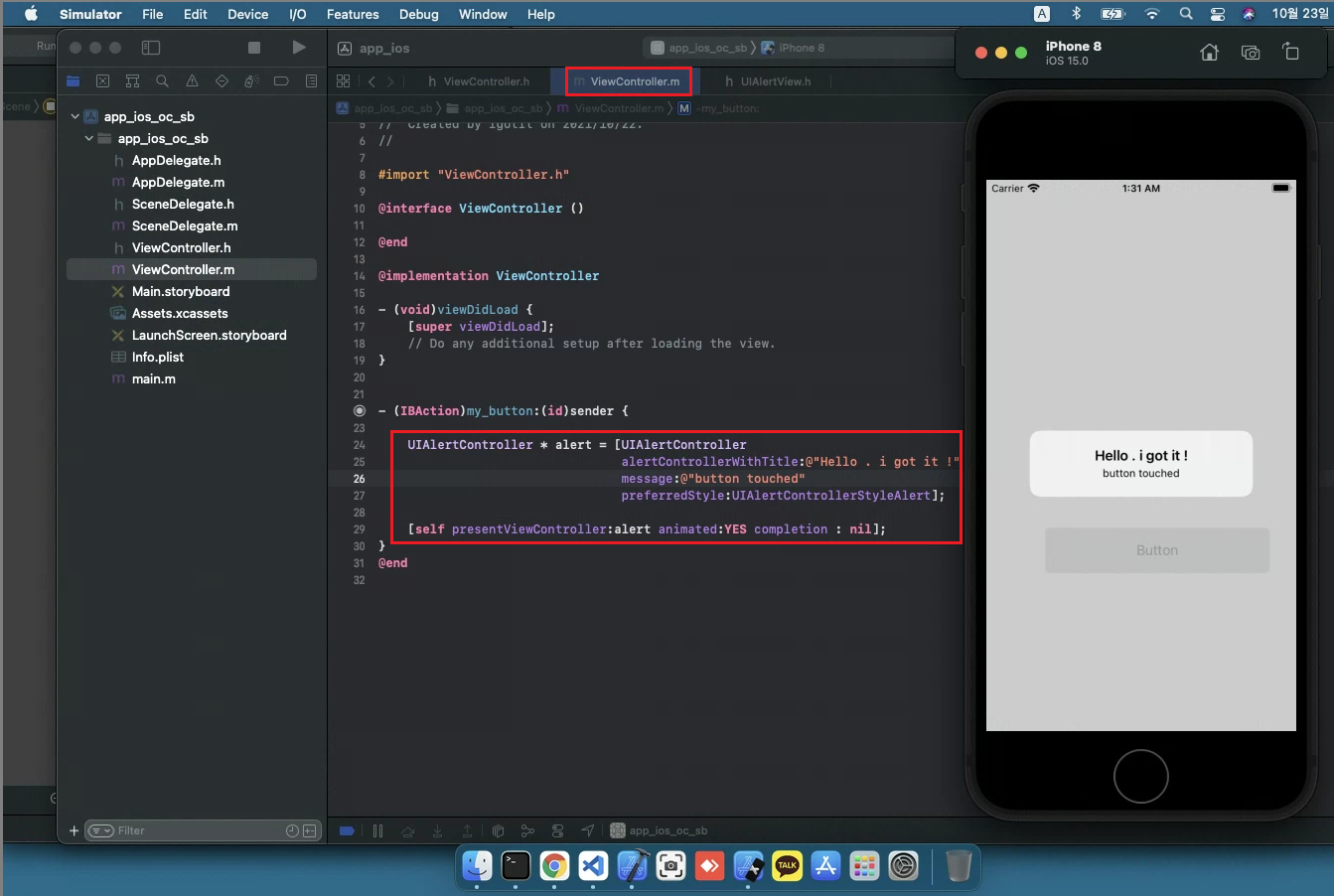 아래 그림의 오른쪽에 시뮬레이터에서 실행모습이 보이며, 버튼 터치하여 alert 창이 뜬 걸 볼 수 있다.