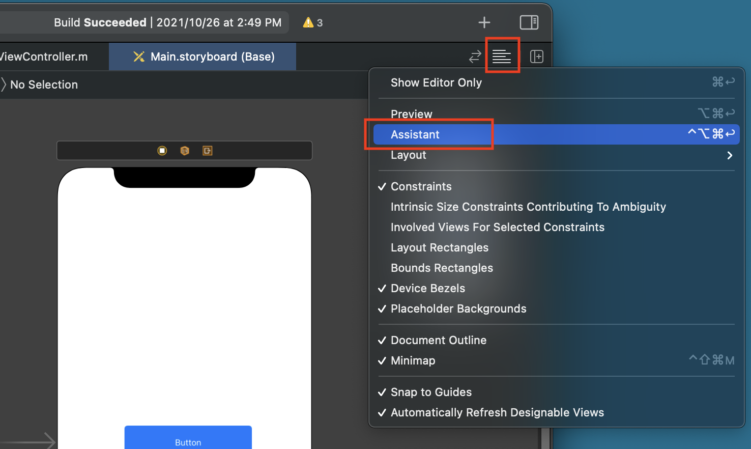 앞의 설명에서는 새로운 Xcode 를 실행하여 드래그 드롭 처리하였으나, 아래 그림의 붉은 박스의 Assistant 클릭하면 코드창이 추가되어 드래그드롭 처리하기 더 편리하다.