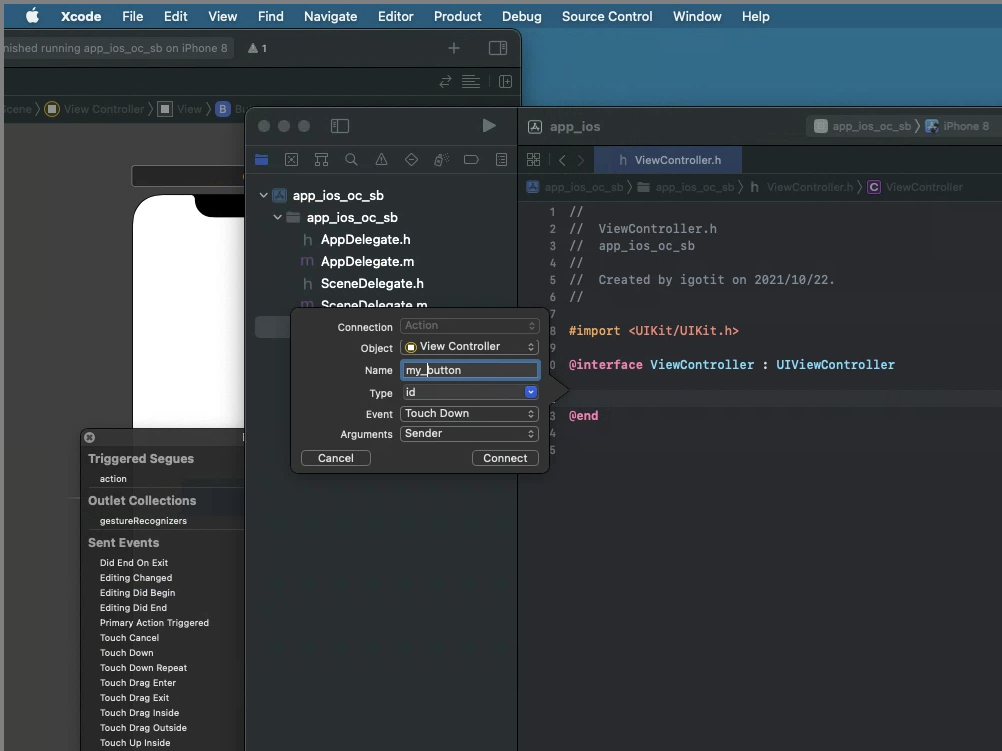 Main.Storyboard 에 보이는 버튼을 마우스 우클릭하여 보이는 창에서 Touch Down 오른쪽에 보이는 원형 부분을 마우스로 클릭하여 드래그 하면서 새창으로 열어둔 ViewControl.h 파일내용중 @interface 와 @end 사이에 드롭하면 아래그림처럼 작은 창이 뜬다.