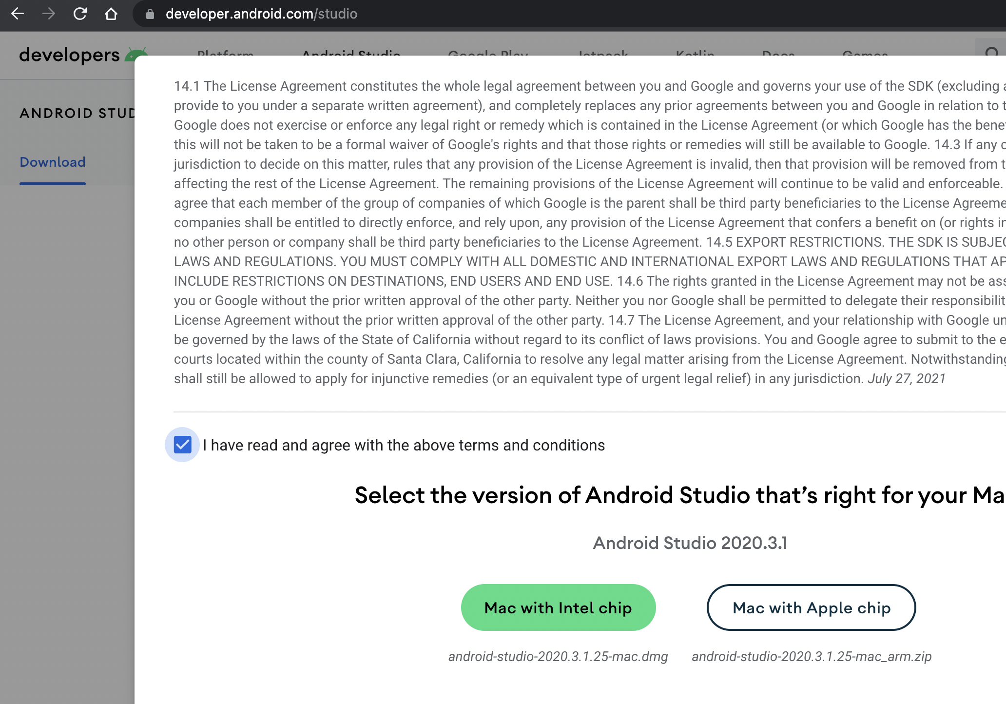 위 주소에서 다운로드 진행시 라이센스 동의하고 최종 부분에 2개 중 1개 선택해야 하는데, 맥북의 CPU 가 인텔 CPU 인 것과 apple 자체 cpu 인 것에 따라 설치 파일 다른 것을 받아야 한다. 본 예에서 맥북 M1 에 설치 하므로 오른쪽 것 Mac with Apple chip선택한다.