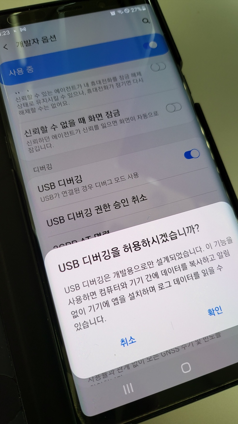 개발자 옵션 터치하면 설정가능 여러 항목이 보이며 , 아래 사진처럼 USB 디버깅 활성화 한다.
