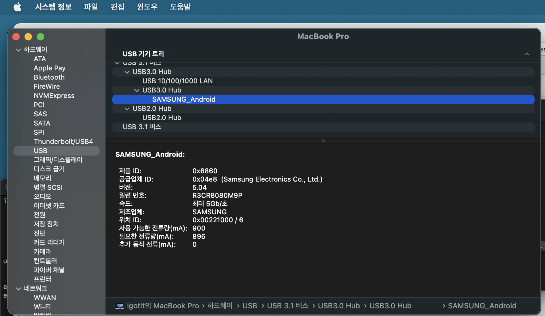 윈도우의 장치 관리자에 해당하는 맥의 시스템 정보 중 USB 항목에 연결된 폰 의 를 장치 인식 상태 보인다.