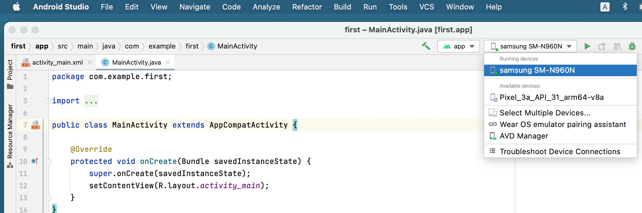 앞의 과정에서 PC 에서 인식완료된 상태에서 안드로이드 실행해보면 실행타겟 부분에 자동으로 연결된 폰이 보인다.