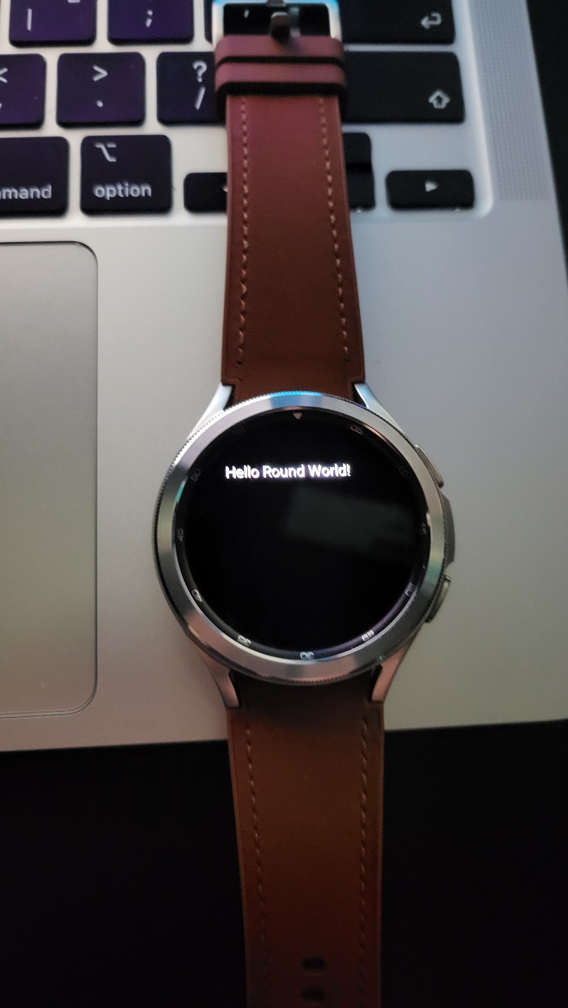 앞의 그림에서 실행타겟을 실제 기기 (samsung SM-R890 ) 선택한 상태에서 붉은 박스 안 버튼 플레이 클릭하면 빌드 완료되고 워치4에서 즉시 실행 모습(아래 사진) 볼 수 있다.