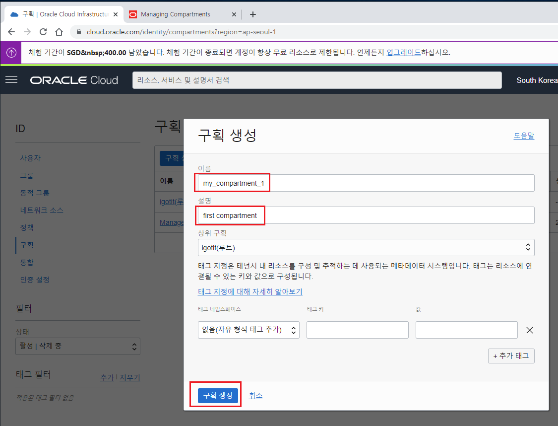 오라클 클라우드에서 구획(Compartment) 생성 .