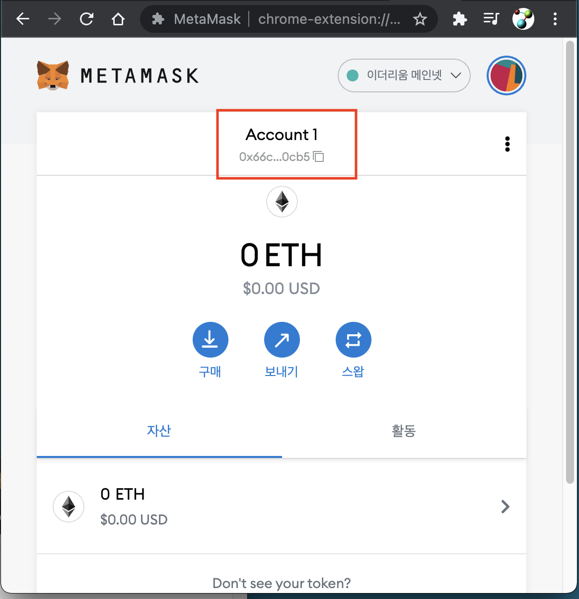 위 그림에서 모두완료 클릭하면 아래그림처럼 본인 지갑 화면이 보인다. 붉은 박스 부분에 기본 계정 Account1 이 만들어져 있고 주소도 보인다. 이 영역을 클릭하면 복사되고 거래소 등에서 본인 메타마스크 지갑으로 이더리움 송금시 사용될 주소이다.