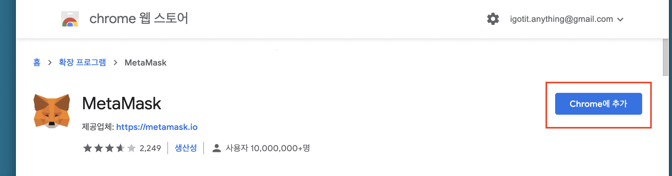 크롬 브라우저에서 Chrome 웹스토어 방문하여 검색란에 MetaMask 로 검색하여 보이는 아래 화면에서 크롬에 추가 클릭.