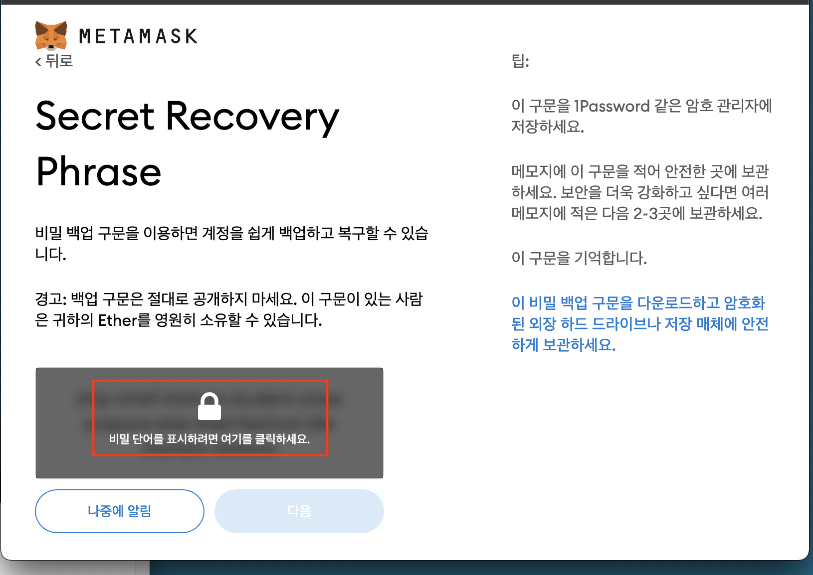 이후 진행과정중 가장 중요한 복구구문 받아적어두기 . 아래 붉은 박스 부분 클릭하면 단어들이 보인다. 이건 본인만이 저장해두고 있어야 하며 다른 누군가에게 공개하면 절대 안됨.