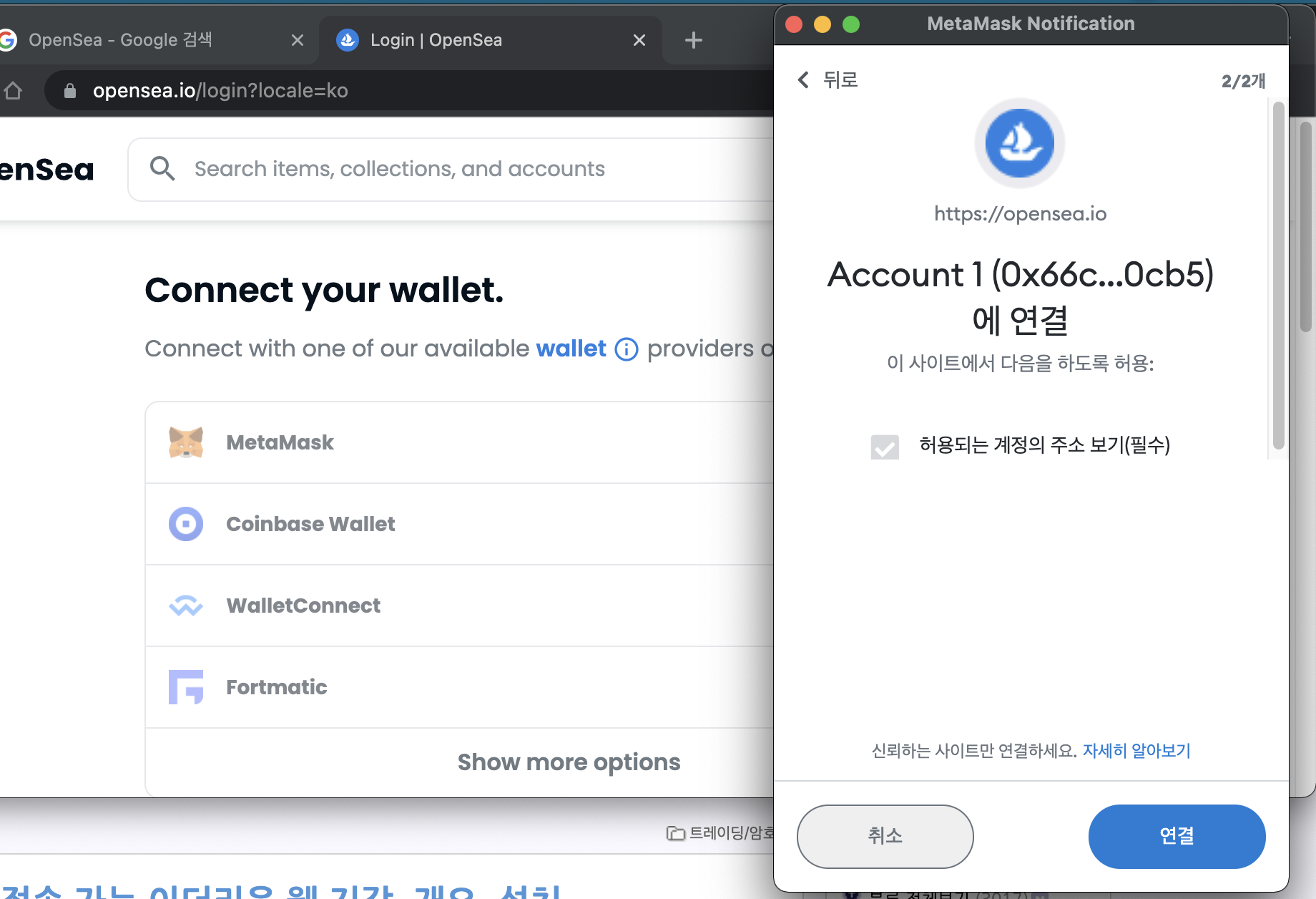 아래그림. MetaMask 연결 설정 창이 보인다. 본인의 계정을 선택하고,