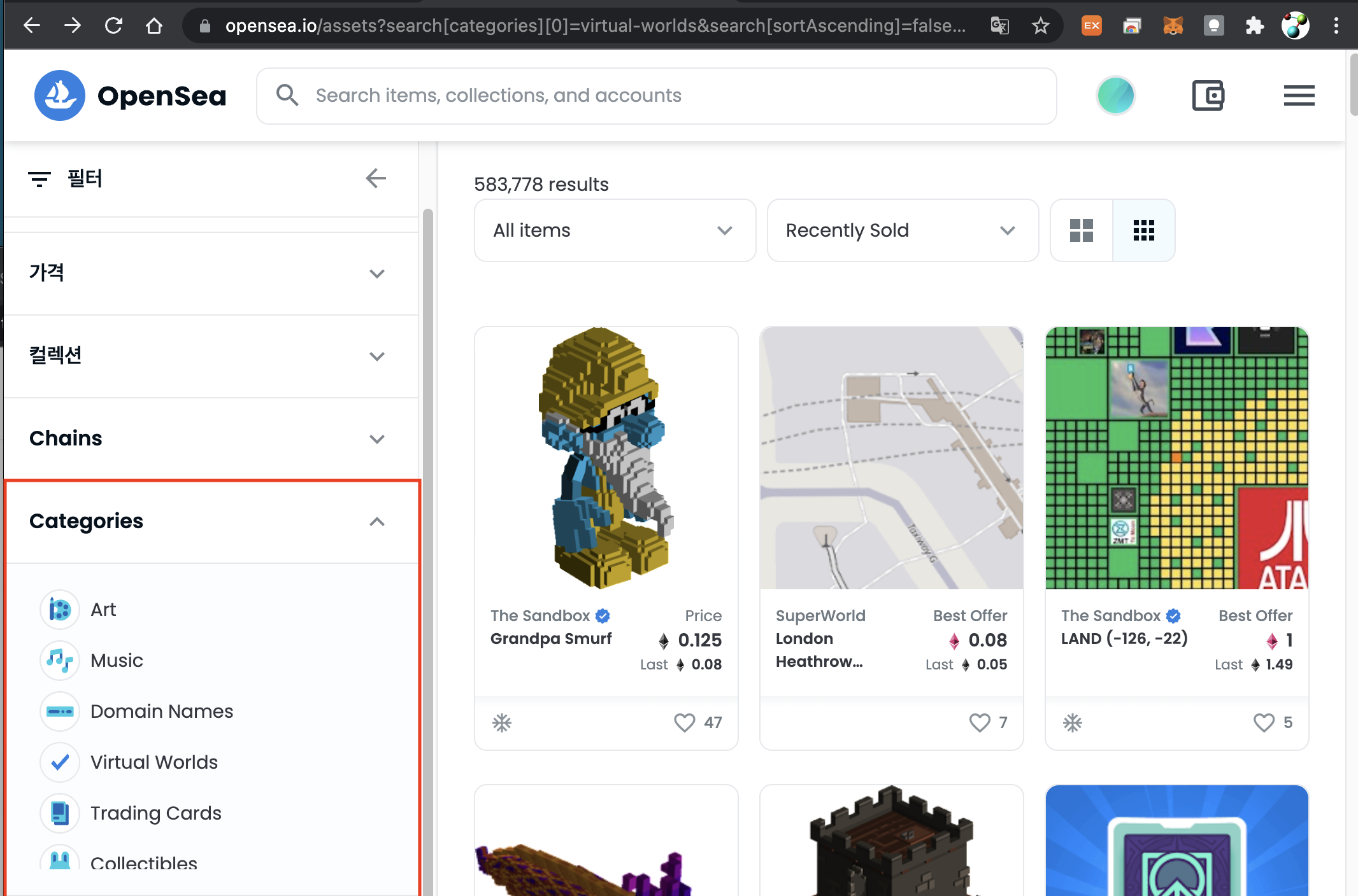 - 아래 그림의 OpenSea 의 분류명을 보면 어떤 것들이 등록 되어 거래 가능한지 감 잡을 수 있다. 그림, 음악 , 도메인이름, 3D 모델, .. 등 이 보인다. 이후 점점 더 많은 분류가 추가될 것이다.