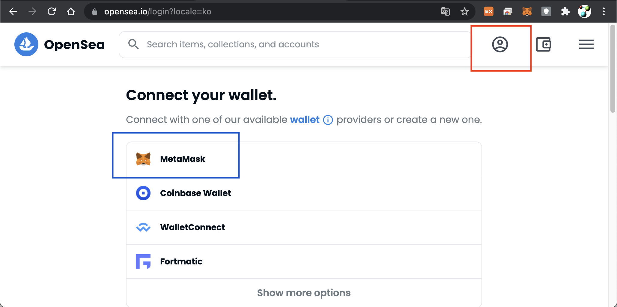 https://opensea.io/ 클릭하여 보이는 opensea 웹페이지(아래그림) 의 우상단의 사람모양 아이콘 클릭하여 보이는 MetaMask 클릭