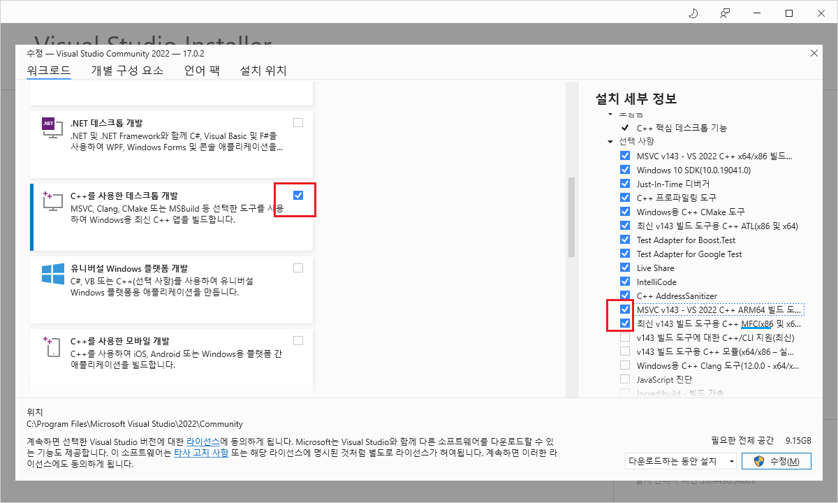 Visual Studio 실행하여 메뉴 : Tools -> Get Tools and Featues... 클릭하여 뜬 아래 창에서 상단 탭 워크로드 에서 C++ 을 사용한 데스크톱 개발 선택하고, 오른쪽 세부 선택에서 붉은 박스 부분 추가 선택하여 버튼 수정 클릭하면 설치완료됨.