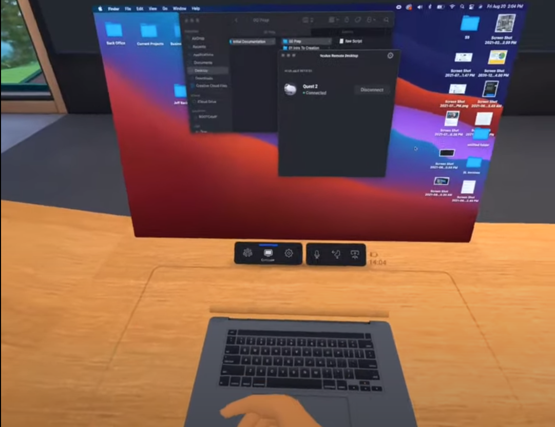 아래 그림. VR 환경내부로 나의 컴퓨터 화면과 키보드가 표현되어 VR 속에서 활용가능. 현재(2022년 1월)는 모니터 1개만 가능.