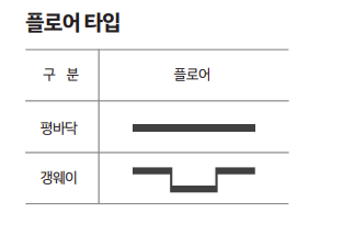 갱웨이 타입 : 승객석 바닥처리에 있어서 앙쪽 창가쪽이 중앙보다 더 높게 된것.