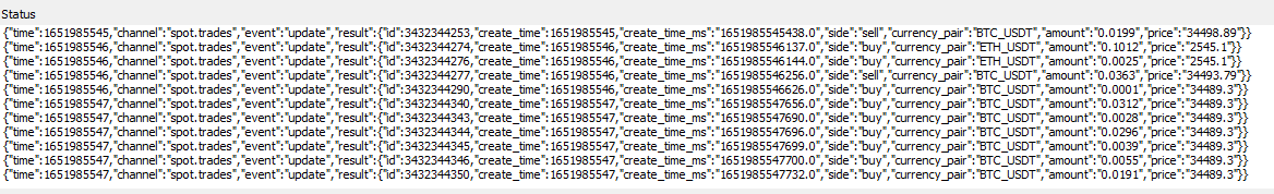 게이트아이오의 웹소켓 공통 규격 에서의 요청 성공여부 부터 먼저 수신되며 이후 실시간 시세 연속적으로 수신된다.
