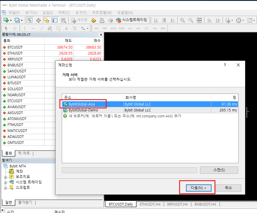 서버는 BybitGlobal_Asia 선택하고 버튼 다음 클릭한다.