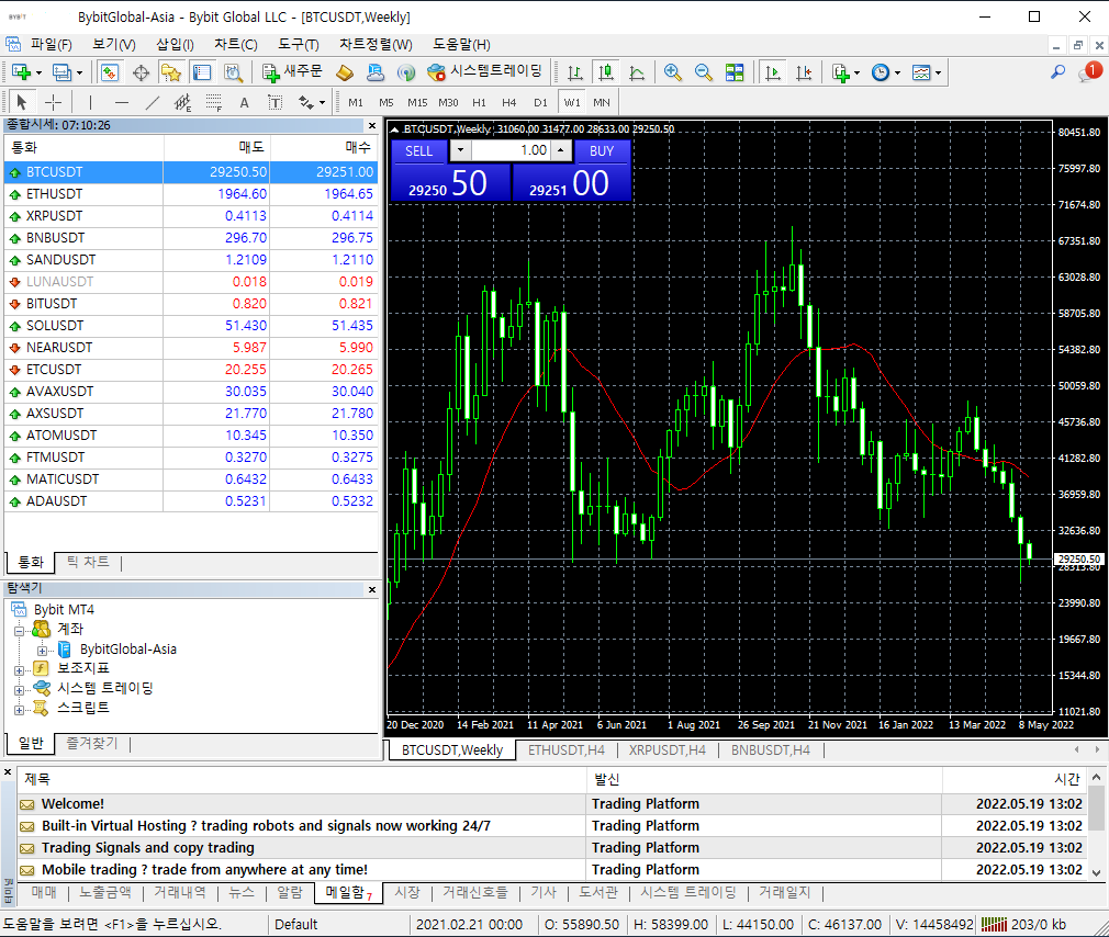 바이비트 MT4, 웹 가격 차이 확인 bybit 거래소에서 제공되는 메타트레이더4 에서 거래 가능한 종목들은 BTCUSDT , ETHUSDT 류의 리니어 선물 종목들이기 때문에 메타트레이더에서 제공되는 가격