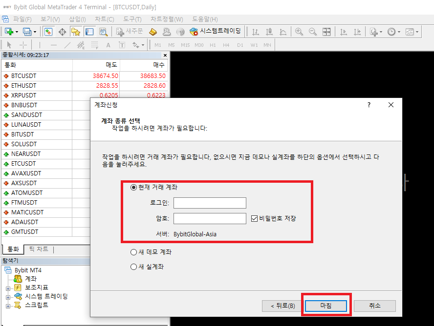 - 메일로 받은 MT4 전용 계정과 임시비번을 아래 붉은 박스 부분에 기록하고 버튼 마침 클릭.