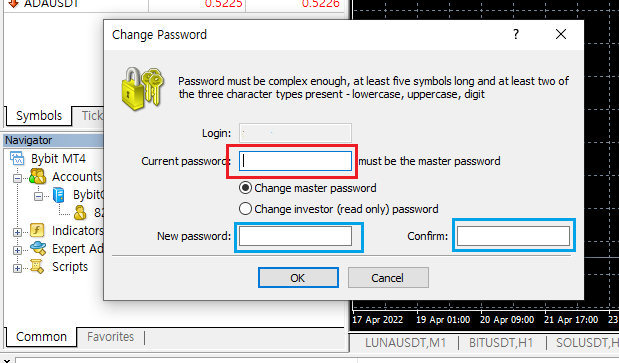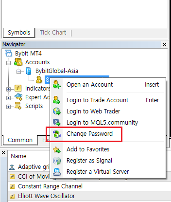 메타트레이더 실행하여, 왼쪽 Navigator 의 Accounts -> BybitGlobal-Asia 하위에 본인 계정 우클릭하여 Change Password 클릭한다.(아래그림 붉은 박스)