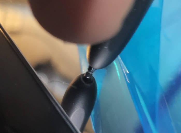 확인 방법 . 뾰족한 팁 같은것을 면에 접촉시켜서 반사된 쪽의 팁이 공백 없이 닿아있다면 해당 면이 반사처리된 쪽이다. 아래 사진은 파랑 비닐 부착된 면에서 팁의 반사 모양인데 맞닿아 있다. 즉, 이 면이 반사 처리된 면임을 알 수 있다.