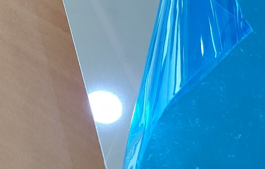 사유 : 파랑색 비닐 있는 쪽은 고품질 광학 평면이 아니어서, 반사광들이 산란되고 있다. 그 결과 반사상 경계가 또렷하지 않고 번져 보인다. 아래 사진에서 반사된 밝은 원형 부분이 천정에 있는 조명이 반사된 것인데 상이 또렷하지 않다.
