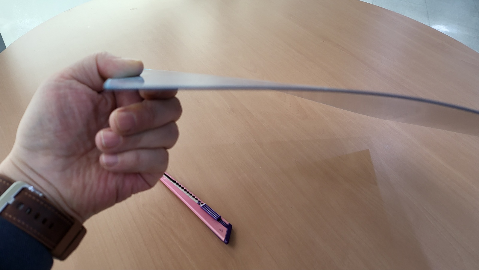 판재의 끝부분만 잡았을 때 휘는 정도 확인.