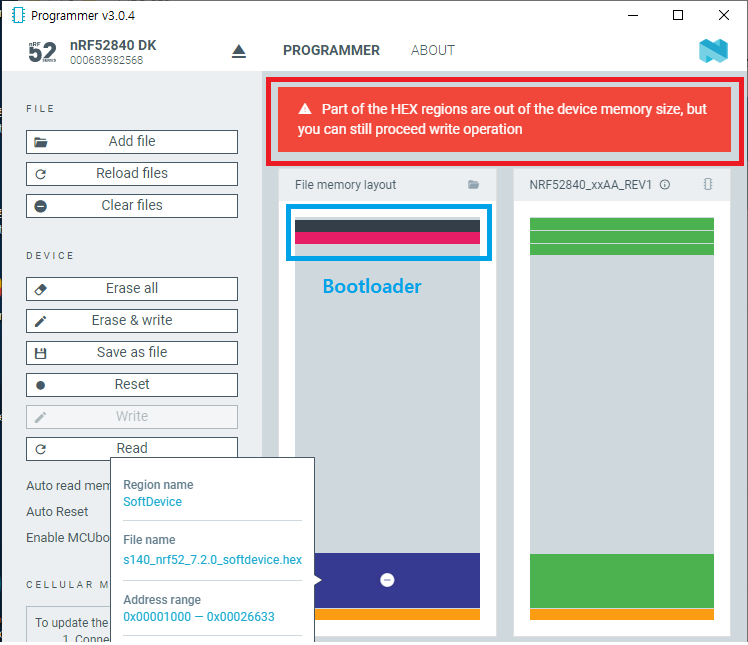 Part of the HEX regions are out of the device memory size...from Programmer v2.2.0 - Nordic Q&A - Nordic DevZone - Nordic DevZon