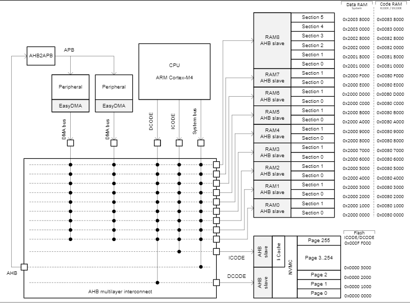 RAM AHB slaves 0 to 7 are connected to two 4 kB RAM sections each, while RAM AHB slave 8 is connected to six 32 kB sections.