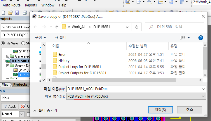 파이형식에서 PCB ASCII File (*.PcbDoc) 을 선택하고 파일이름에는 ASCII 임을 식별가능하게 ASCII 추가하여 저장한다.