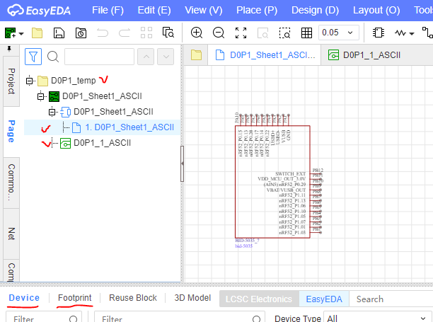 임포팅 진행완료되면 아래처럼 EasyEDA 에 프로젝트 추가 되고 회로도와 PCB 모두 생성된다. 부품들은 symbol 은 Device 에, 풋프린트는 Footprint 부분에 신규 추가생성된다.